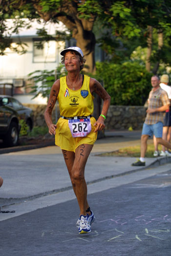 Sister Madonna Buder from Spokane, WA showing good form and good spirit as she runs through Kailua town.