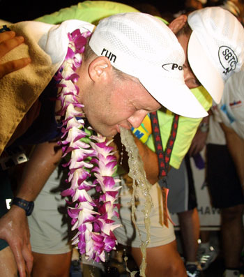 The Ironman course record holder Luc van Lierde of Belgium a few miles from Kona town is caked with his own body’s salt. Not a good foundation for a solid marathon.