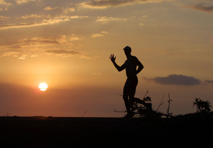Age group runner on Queen K as the sun is setting.