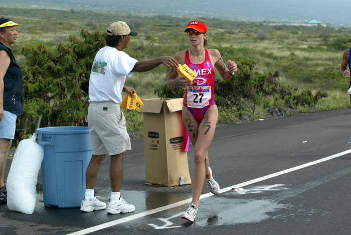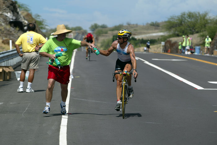 Jan Birger Olsen from Denmark receives much needed sustenance from an aid station volunteer not far from Kawaihae.