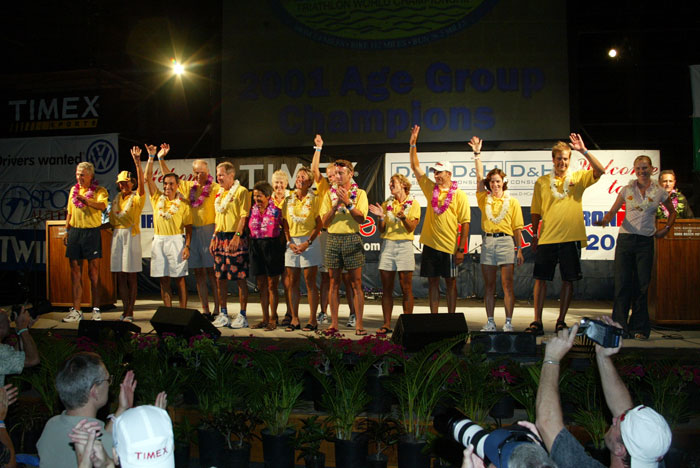 Part of the prerace process, the Carboload Dinner on Thursday is a must for rookie and returning Ironman triathletes. This picture shows last year's age group winners on stage, wearing the yellow 2001 Age Group Winner shirt.