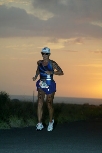 Lesley Cens-McDowell tiptoes out of The Natural Energy Labs as the sun is setting. She once again won her age group, this time the 55-59 bracket by an astounding 43 minutes.