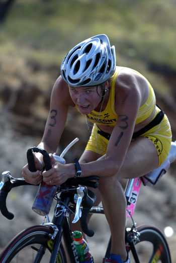Natascha Badmann came out of the water some five minutes down to the lead swimmer and resolutely rode to the front. This picture shows her on the steep climb off the lava fields a few miles before the Kawaihae left hand turn.