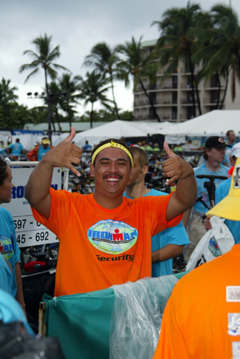 Race day morning started with light sprinkles and dark clouds. The athletes found themselves once again inside the King Kam hotel for the compulsory prerace body marking. Once the gun went off, the race would turn more normal, though the lack of sun and heaving waves made the swim rather dreary and difficult.