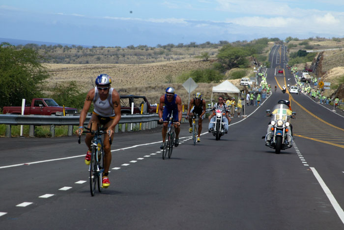 After the long downhill from the Hawi turnaround, the 1997 winner Thomas Hellriegel leads fellow German Jürgen Zäck and Chris McCormack, Australia's Hawaii Ironman rookie, who would be first out on the run, but soon DNF. Norman Stadler, also from Germany, is approaching. Thomas and Jürgen maintained a German lead all the way back into town. Once in the transition area, Jürgen, with a penalty, could only watch from the sin bin as Chris and Thomas took off. Three minutes later he would be allowed to change into running gear; later in the run he pulled himself out of the race.