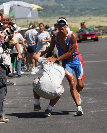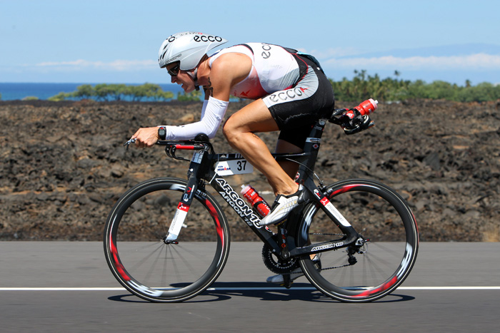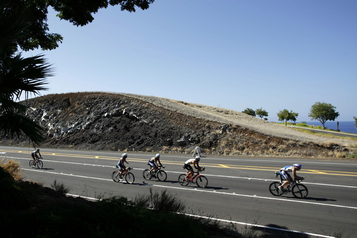 Pro men about halfway through the bike. In this image, Australia's Chris "Macca" McCormack is stretching out his hand in a futile gesture towards the riders that are just passing him, undoubtedly screaming, "Come on, mates, that gap is no more than a couple of meters!" Macca would eventually win the race in a time of 8:15:34 (51:48, 4:37:32, 2:42:02).