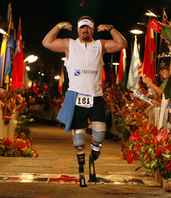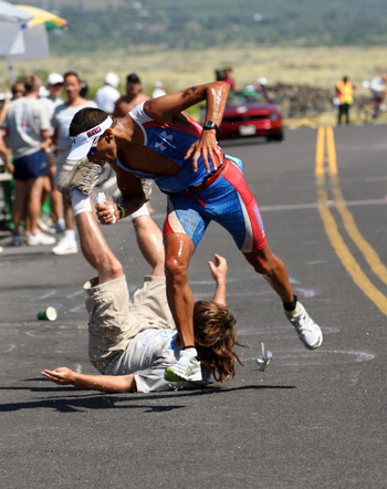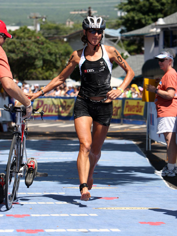 Ironman rookie Chrissie Wellington from the United Kingdom gets off the bike in first place, as if to say, "Yes, I've been waiting all day to run a marathon." And run she would.
