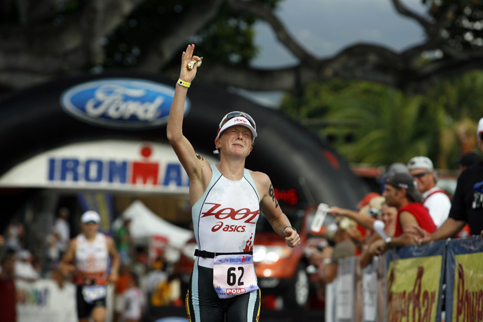 Chrissie crosses the finish line in first place, recording the second fastest run split ever and the first female rookie win in Kona in many years. Her splits were 58:09, 5:06:15, 2:59:57 for an impressive total time of 9:08:45.