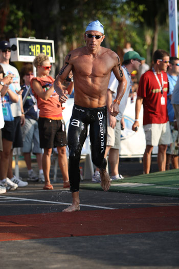 The transition between the swim and the bike can be hairy. Belinda Granger of Australia navigates this without a hitch.