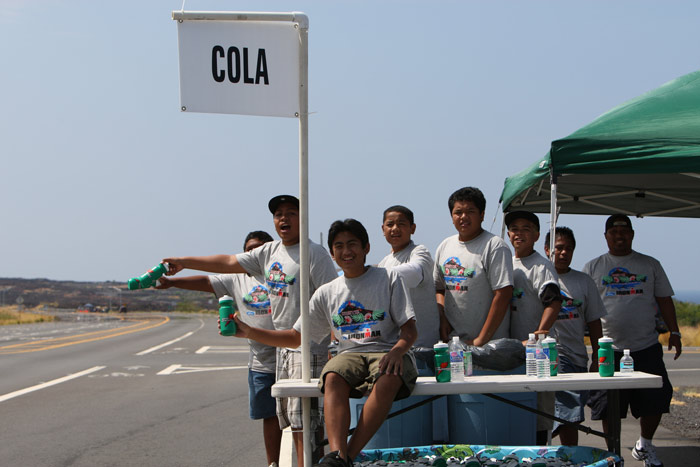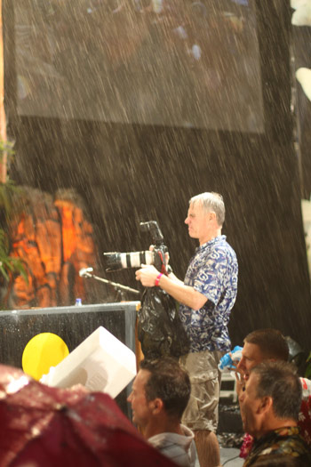 Here is fellow photographer Eric Lars Bakke, in a borrowed Aloha shirt, looking with apprehension at $10,000 worth of camera gear and wondering if the much advertised Canon environmental seals will hold. When not in Kona, he shoots the relatively sedate sport of football for the Denver Broncos. In the bottom right hand corner is a roaring Dave Orlowski, a finisher in 2008 and one of the twelve original ironmen from the February 1978 race on Oahu, where he was third. He would not miss this epic Ironman experience for anything.