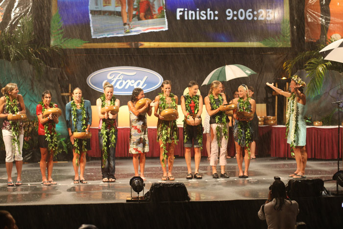 In this my 26th consecutive visit to the Kona race, the awards presented something new. Rain, and lots of it. The audience had by now been reduced to the indefatigable--many of those nutheads who got involved in this sport in the first place. This panoramic view has the top ten women, flanked by Chrissie to the right and Dede Griesbauer of Stanford University swimming fame to the left. It's hard to tell who is having more fun. It was glorious!