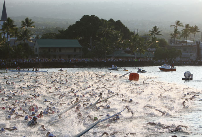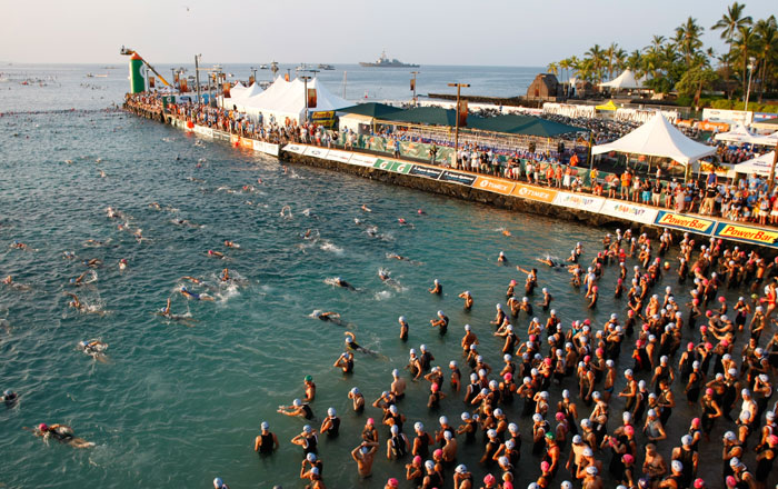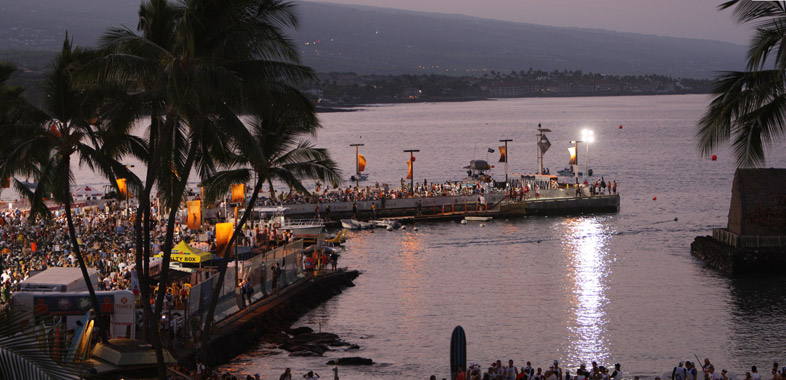 The mass start from the pier with the Hulihee Palace and the church steeple in the background.