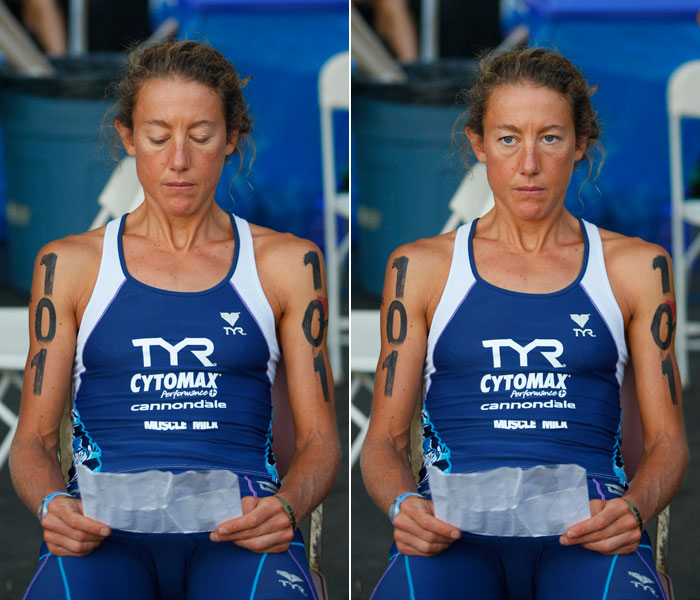 Two-time winner Chrissie Wellington of the United Kingdom sitting alone preparing for the day ahead. Curiously, of the several thousand people on the pier, no one interrupted her.