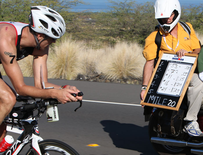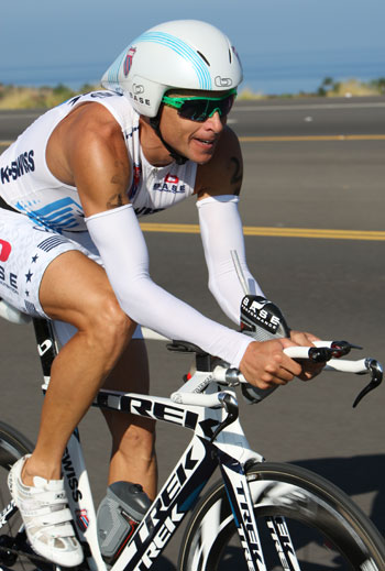 Chris Lieto of Danville, CA is three minutes down out of the water. He takes the lead halfway through the bike.