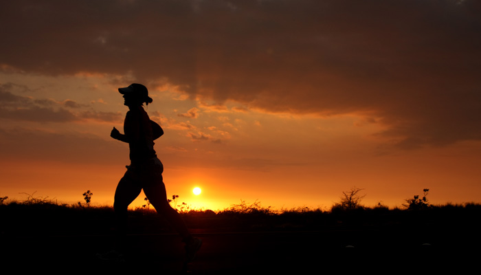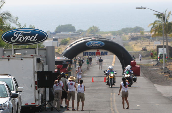 Another great Kona sunset as backdrop to runners coming up the hill from Nellie right before the Ford arch.