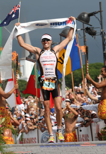 Craig Alexander captures his second consecutive win in Kona. His splits were 50:57, 4:37:33 and 2:48:05 (the day's fastest run). With transitions his total time was 8:20:21.