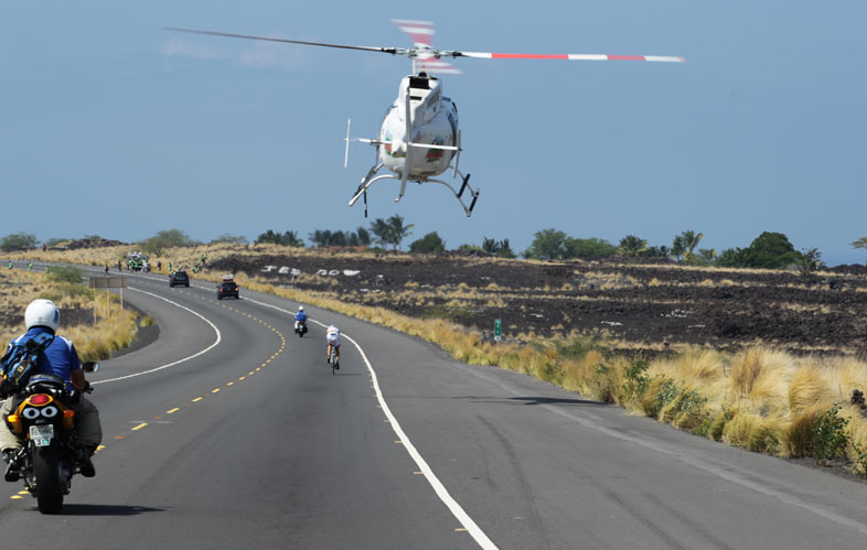 08:47 British triathlete Chrissie Wellington all alone on the lava way behind the leaders, a most unusual sight.