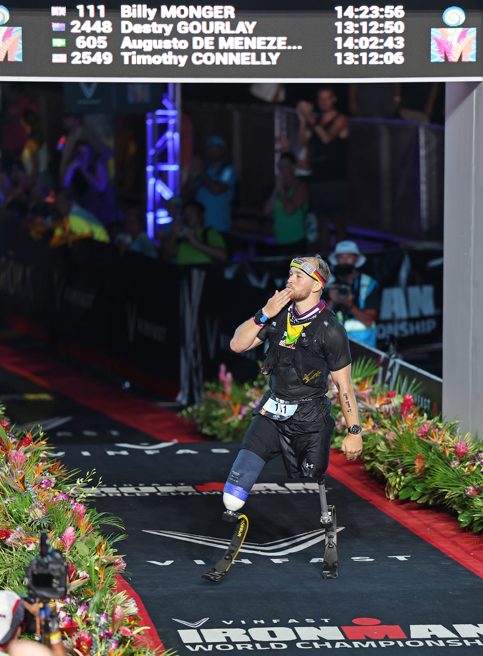 Capture time 20:53: At 25 years old, Bill Monger of the UK finishes and thanks his support crew. His 14:23:56 beats the previous double amputee record by a more than two hours. That result is nothing short of astonishing.